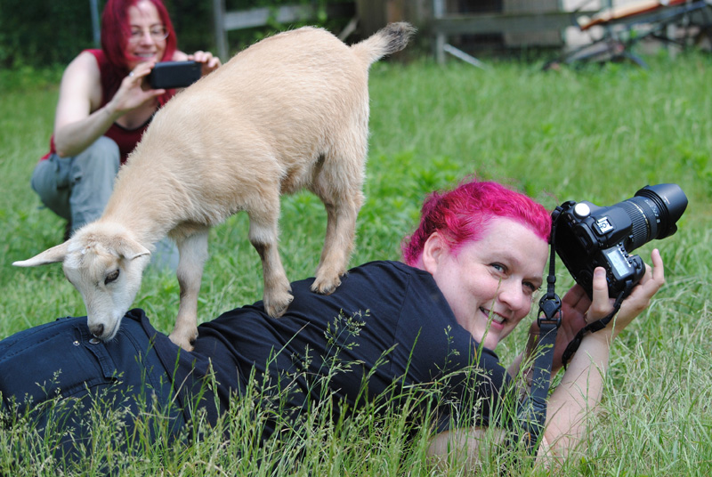 This photo, taken by Patty at Sweet Meadow, encapsulates everything I love about photography. Getting down to goat-level, being outdoors, and really interacting with my subjects. And of course Daisy nibbling at my pocket.
